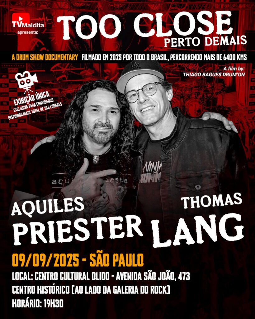 No dia 9 de setembro de 2025, o histórico Centro Cultural Olido, localizado no Centro de São Paulo, será palco da estreia exclusiva e fechada para convidados do documentário Too Close – Perto Demais. Dirigido e filmado em 4K por Thiago Bagues Drum’on, o longa-metragem acompanha a turnê Destruição de Dois Bumbos Tour 2025, que percorreu 6.400 km e passou por 20 cidades brasileiras durante o mês de fevereiro.